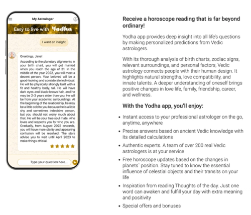 Yodha app provides deep insight into all life’s questions by making personalized predictions from Vedic astrologers.