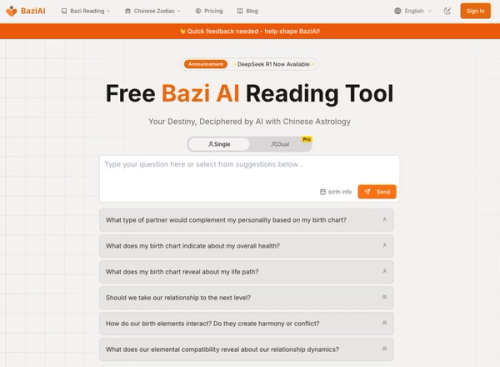 Get free AI-powered Bazi readings combining ancient Chinese astrology with DeepSeek R1 technology. Analyze career, relationships, and life path through intelligent AI interpretation.
